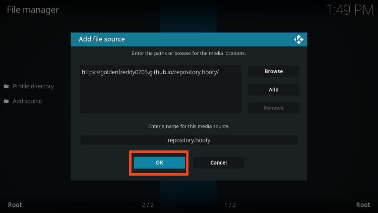 • Type the URL as shown here – https://goldenfreddy0703.github.io/repository.hooty/ and click OK