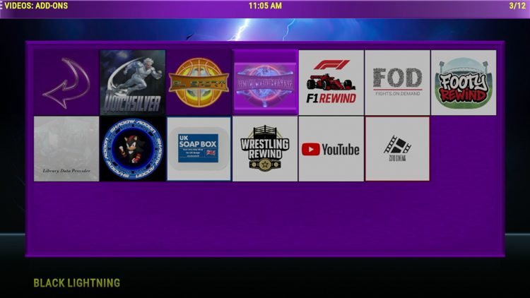 The video add-ons that come pre-installed with this build include Quicksilver, Black Lightning, Shadow, YouTube, FOD, Footy Rewind, and others.