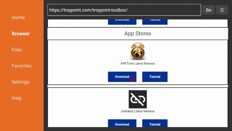 1. Return back to the TROYPOINT Toolbox on the Downloader app. Then scroll down to find APKTime and click Download.